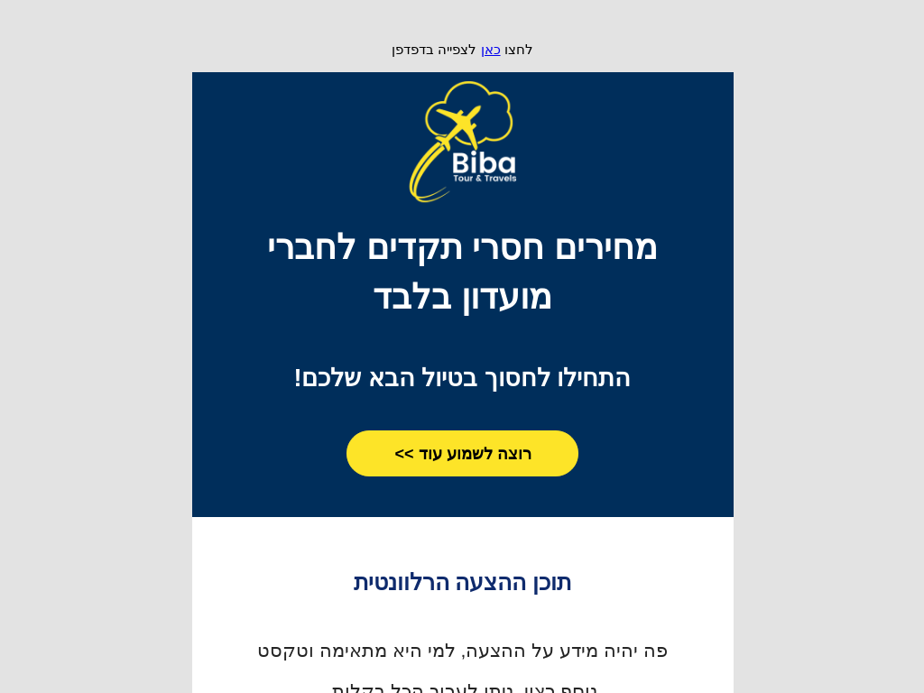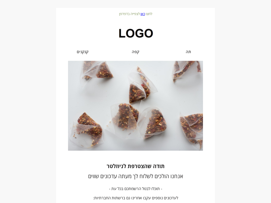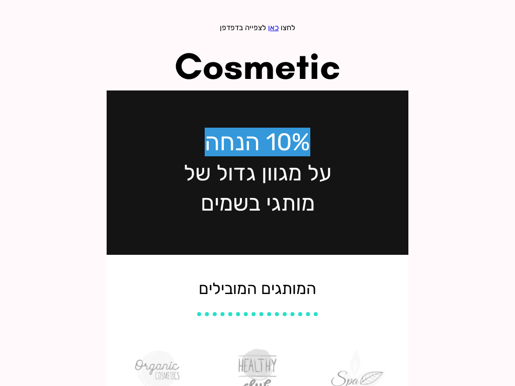 מצאו בקלות את תבניות הדואר האלקטרוניות הטובות ביותר לסוג העסק והמטרות שלכם, עם מגוון רחב של עיצובים, התאמה מלאה לטלפונים ונייחים, עם תוכן דינאמי והמון אפשרויות. הכל נעשה על ידי אנשי שיווק מובילים מהקהילה שלנו.