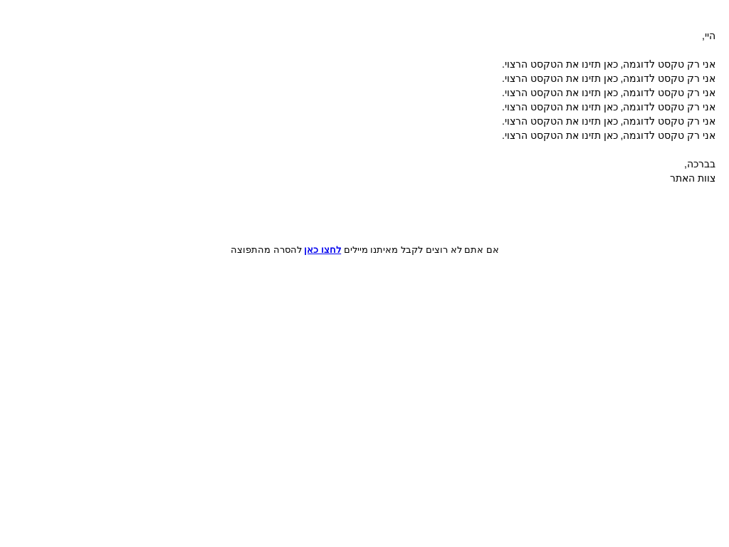 מצאו בקלות את תבניות הדואר האלקטרוניות הטובות ביותר לסוג העסק והמטרות שלכם, עם מגוון רחב של עיצובים, התאמה מלאה לטלפונים ונייחים, עם תוכן דינאמי והמון אפשרויות. הכל נעשה על ידי אנשי שיווק מובילים מהקהילה שלנו.